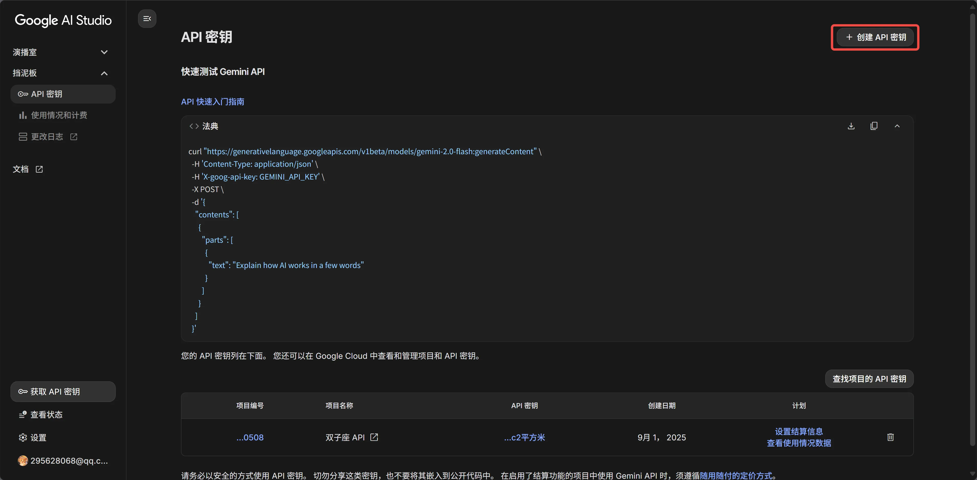 访问 Google AIStudio 申请 API Key:https://aistudio.google.com/apikey