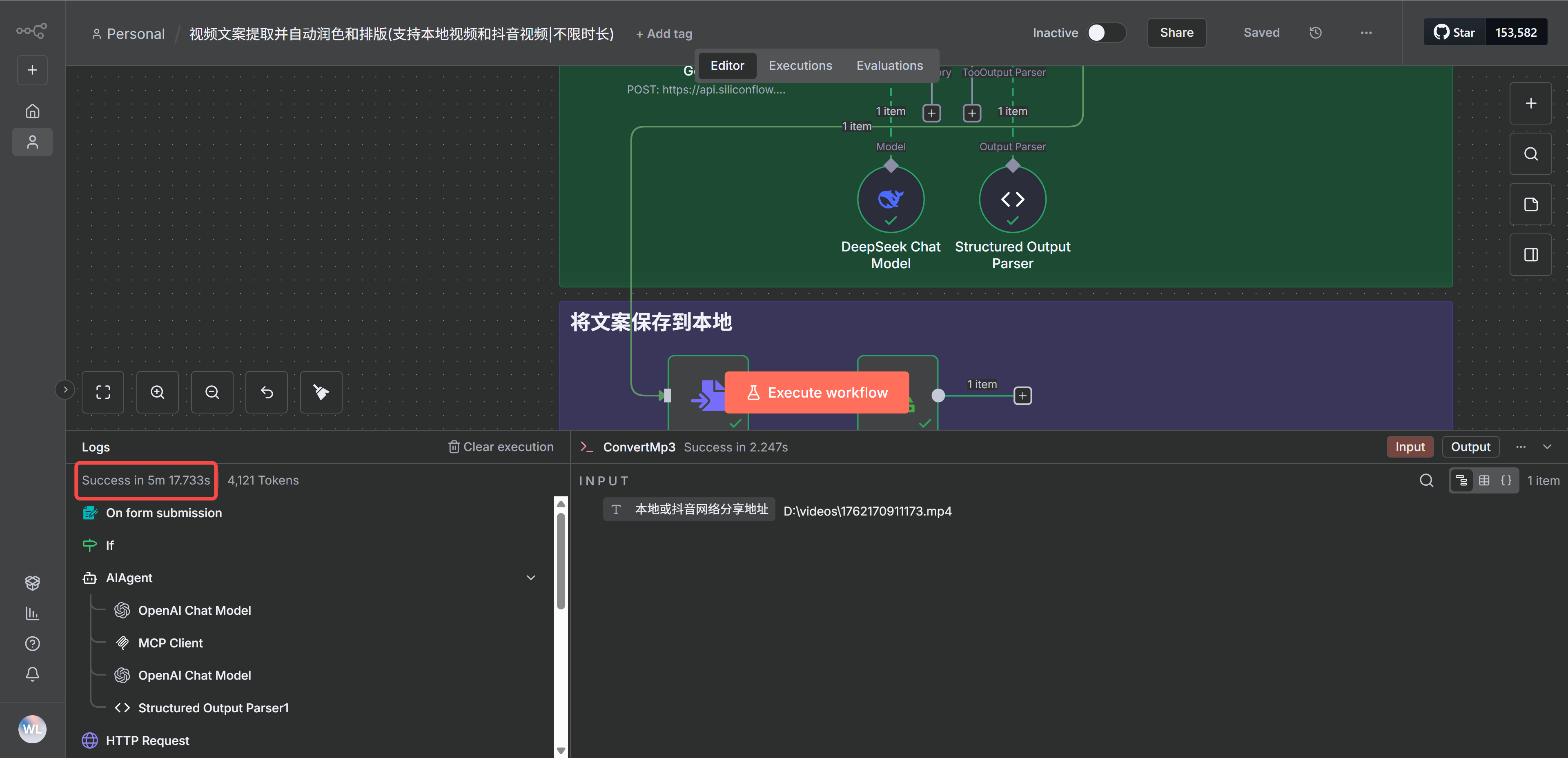 工作流的执行时间和视频的时长大概是 1:1,例如我处理的视频时长是 5 分钟多,执行的时间也大概是 5 分钟多一点,以下是这个视频执行的日志统计时间: